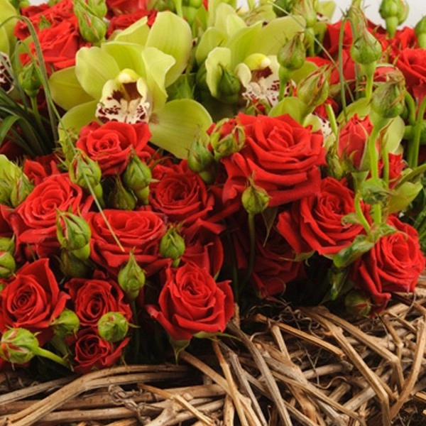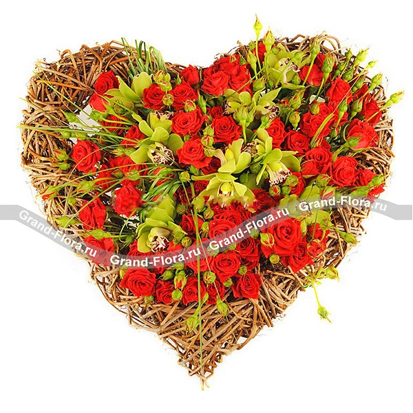 Влюбленное сердце - композиция на оазисе с кустовой розой и орхидеей