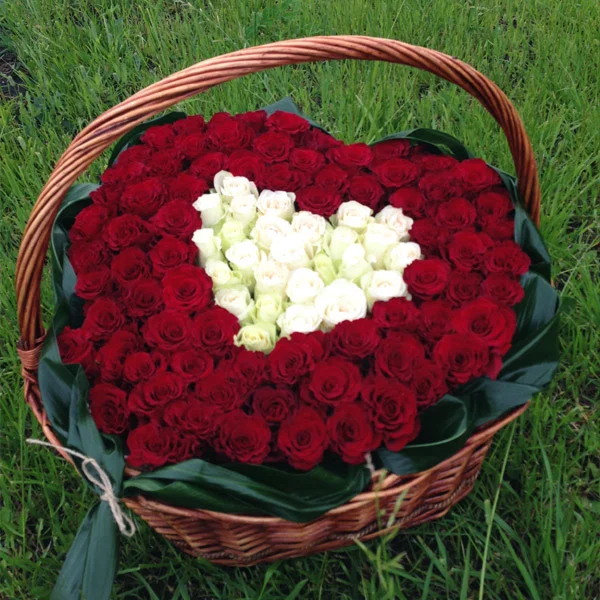 Великолепная корзина из красных и белых роз в виде сердца. Прекрасный подарок самому дорогому человеку, который расскажет все о Ваших чувствах.
