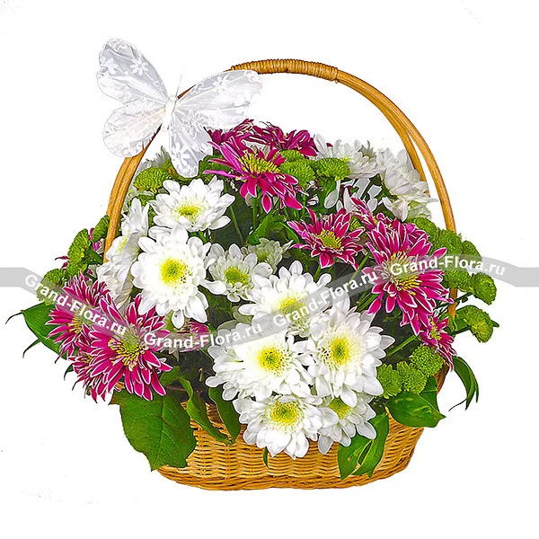 Волшебная корзинка с нежными хризантемами создаст романтичное настроение. Чудесная декоративная бабочка на ручке является стильным дополнением этого флористического шедевра. Сочетание белых, фиолетовых и зеленых оттенков делают корзинку отличным подарком к любому поводу — будь это признание в любви или знак внимания для дорогой мамы. Корзинка украсит интерьер и будет долго радовать вас своим изысканным видом.