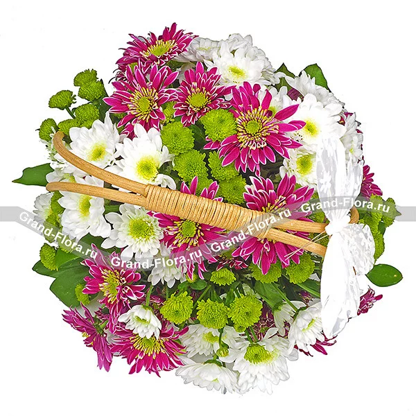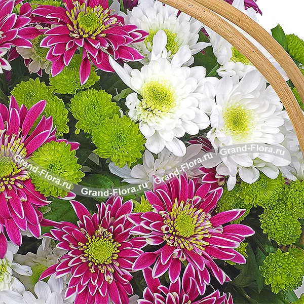 Стандартная (на фото): хризантема кустовая зеленая - 5 шт, хризантема кустовая белая - 5 шт, хризантема кустовая фиолетовая - 5 шт, декоративная зелень, корзина средняя, оазис,