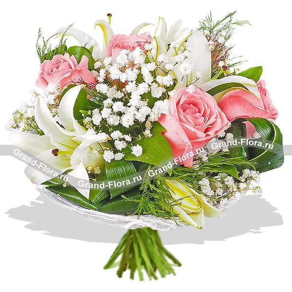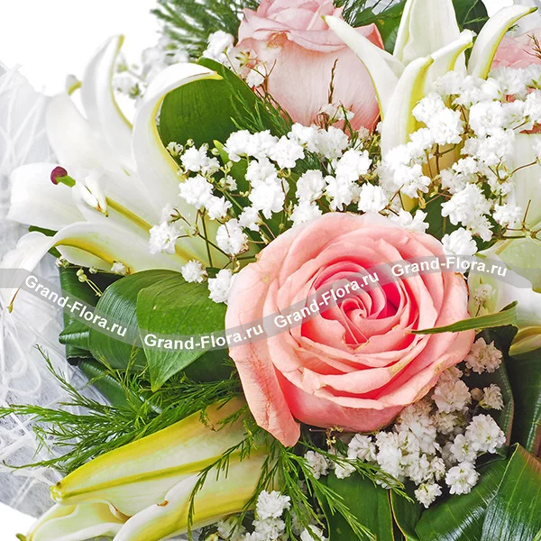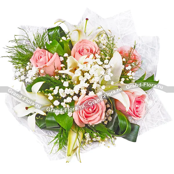 Стандартный (на фото): роза розовая - 5 шт, лилия белая - 2 шт, гипсофила - 2 шт, аспарагус - 2 шт, декоративная зелень, лист аспидистры загнутый - 4 шт, сетка белая. Примерный диаметр букета 30х30 см.