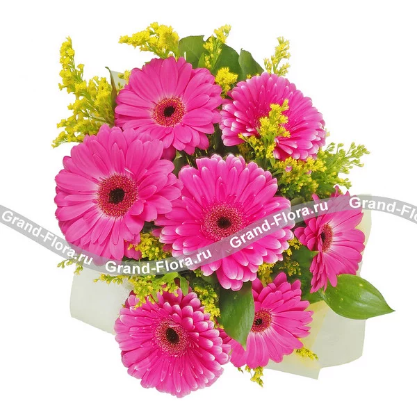 Стандартный (на фото): гербера малиновая - 7 шт, солидаго - 5 шт, рускус, фетр светло-желтый.
