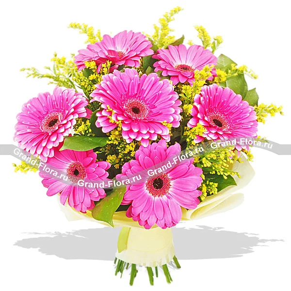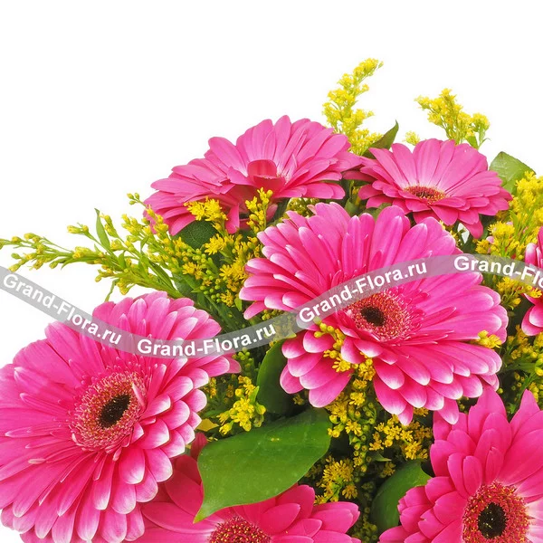 Гербера – удивительный цветок. Он способен отводить от грустных мыслей, настраивать на позитивный лад, вселять надежду на прекрасное будущее. Букеты с герберами приносят счастье и удачу в начинаниях, это отличный подарок коллеге, подруге, любимой девушке, которая находится в состоянии упадка жизненных сил. Милыми элементами декора в данной композиции служат веточки солидаго.