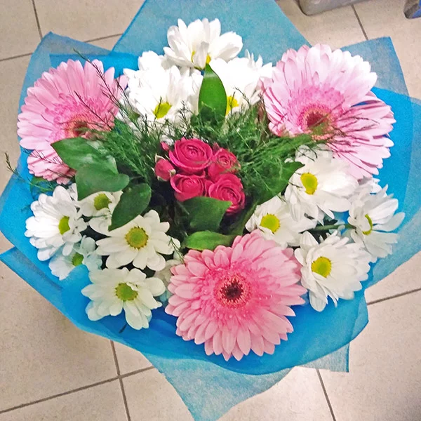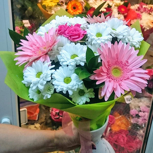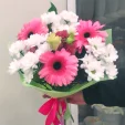 (на фото) гербера розовая - 3 шт, хризантема кустовая ромашковая - 3 шт, роза кустовая розовая - 1 шт, рускус, упаковка, лента. Примерный диаметр букета 30х30 см.