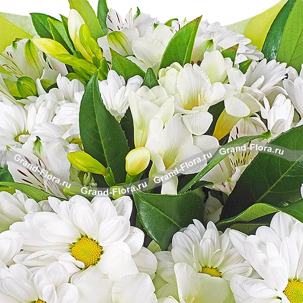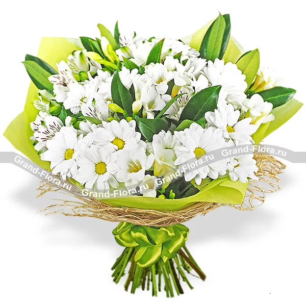 ДЕЛЮКС: хризантема кустовая ромашковая - 15 шт, фрезия/альстромерия белая - 10 шт, альстромерия белая - 14 шт, салал, фетр зеленый, натуральная упаковка.