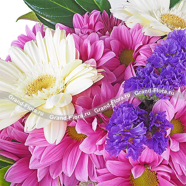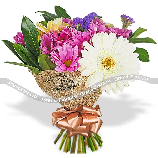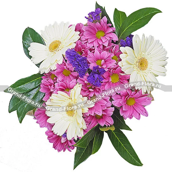 Стандартный (на фото): хризантема кустовая ромашковая (фиолетовая) - 4 шт, гербера белая - 3 шт, статица - 1 шт,салал, натуральная сетка (коричневая), бант коричневый.