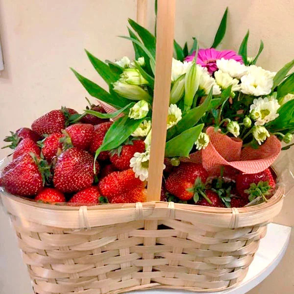 Прекрасная белая альстромерия и ароматная свежая клубника, создали неповторимый дуэт нежности и романтики. Композиция в корзинке, способная пробудить самые светлые чувства, подарить море эмоций и наполнить день Ваших любимых людей приятными впечатлениями и вкусными ягодами.