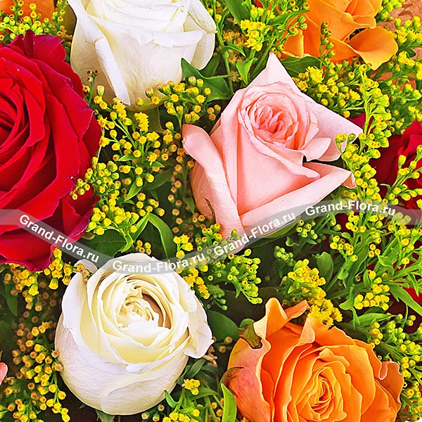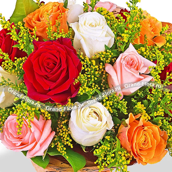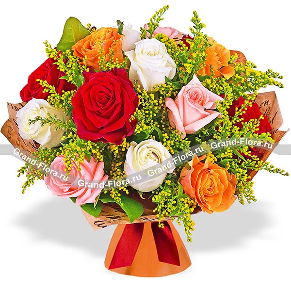ЛЮКС: роза красная - 9 шт., роза розовая - 6 шт., роза белая - 8 шт., роза желтая - 6 шт., солидаго - 7 шт., крафт., лента.