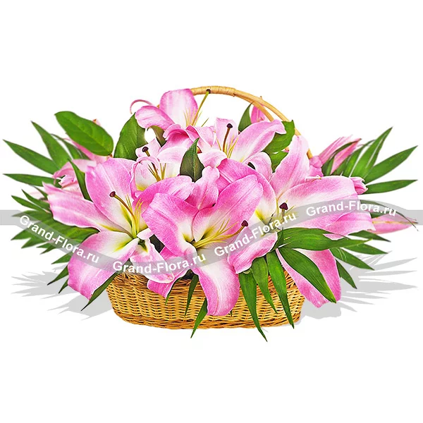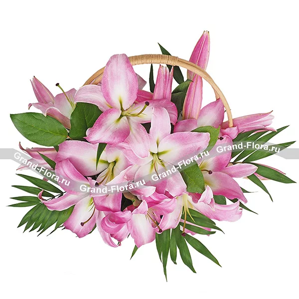 ДЕЛЮКС: лилия розовая - 7 шт., салал, лист рабелини - 5 шт., оазис, корзина.