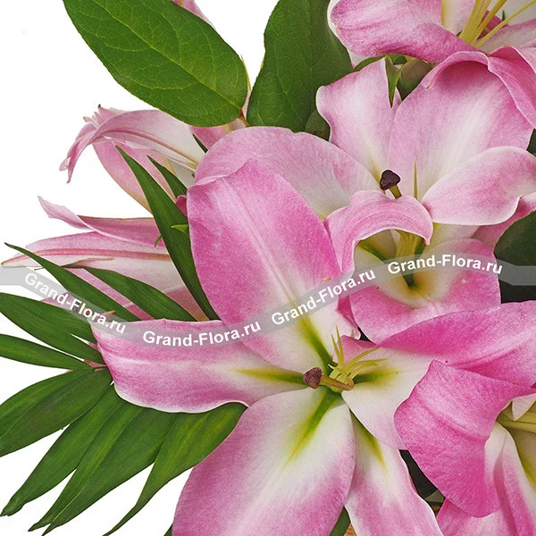 Стандартный (на фото): лилия розовая - 3 шт., салал, лист рабелини - 3 шт., оазис, корзина.
