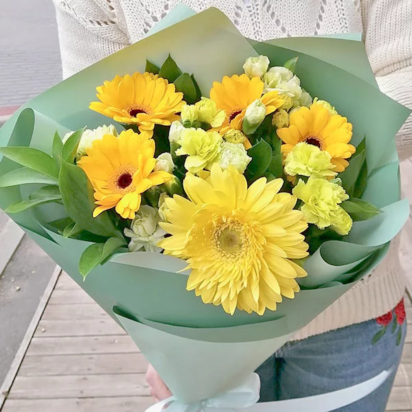 ЛЮКС: гербера желтая - 5 шт., хризантема кустовая зеленая - 5 шт., берграсс, рускус, фетр зеленый.