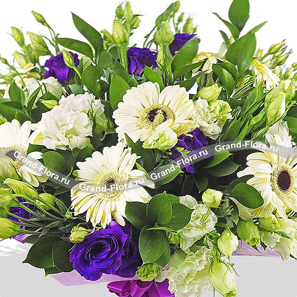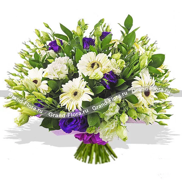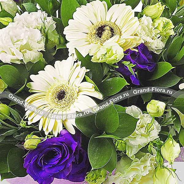Стандартный (на фото): гербера белая - 7 шт., эустома белая - 3 шт., эустома фиолетовая - 3 шт., рускус, фетр фиолетовый, бант фиолетовый.