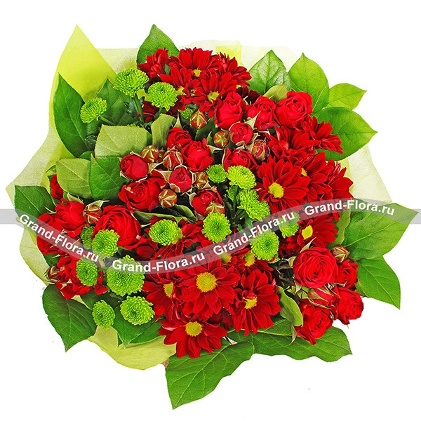ЛЮКС: хризантема кустовая красная - 5 шт., хризантема зеленая кустовая - 5 шт., роза красная кустовая - 6шт., салал, фетр зеленый.