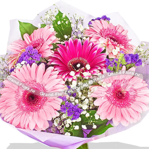 Нежный букет из розовых и малиновых гербер аккуратно оформлен статицей, гипсофилой и декоративной зеленью. Данная композиция будет прекрасным дополнением к подарку дорогой маме, сестре или подруге. Универсальный букет можно вручить как на день рождения, так и без особого повода.