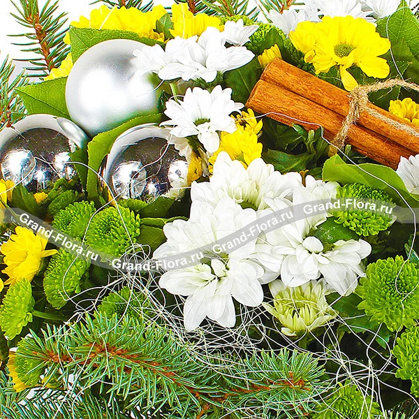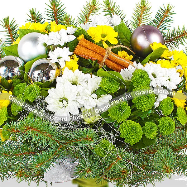 Уменьшенный: хризантема желтая ромашковидная - 2шт., хризантема зеленая (сантини) - 1шт., хризантема белая ромашковидная - 2шт., еловая ветвь, корица, новогодний декор и зелень, сетка.