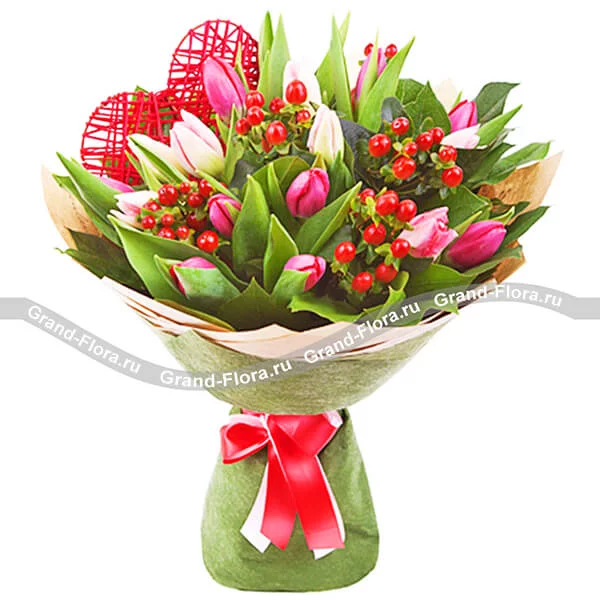 7 тюльпанов : тюльпаны розовые - 4 шт, тюльпаны белые - 3 шт., гиперикум - 2 шт., декоративное сердце, упаковка, розово-белый бант.