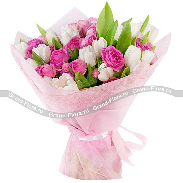 ДЕЛЮКС: тюльпаны белые - 25 шт., роза розовая кустовая - 7 шт., фетр розовый, лента розовая.