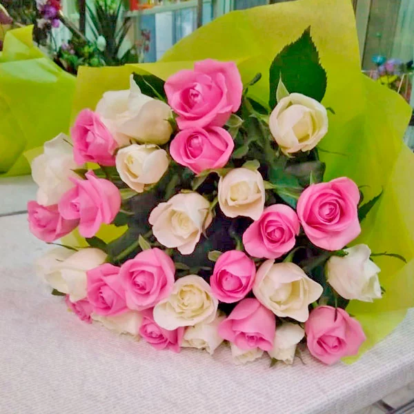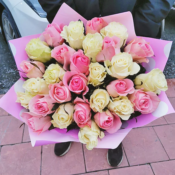 Роза белая (кремовая) и розовая 70 см - 37 шт , упаковка фетр.