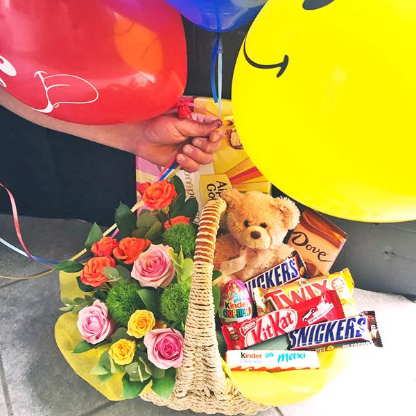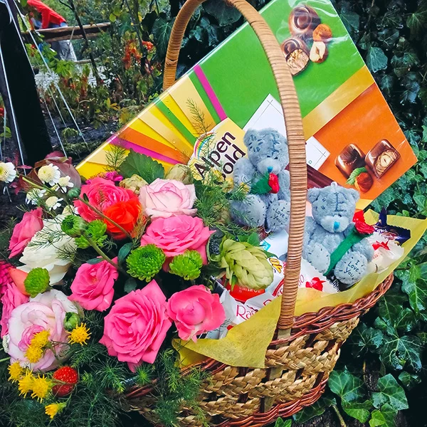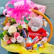 ЛЮКС: роза (микс) - 5 шт., хризантема (зеленая) - 2 шт.( возможна замена на хризантему другого цвета), декоративная зелень, оазис, корзина средняя, желтый фетр, розово-зеленый бант, мишка "Teddy" (возможна замена на плюшевого мишку)- 1 шт., коробка конфет "Alpen Gold" (163 г.) - 1 шт., шоколад Dove - 1 шт., Яйцо "Kinder" - 1 шт., Snikers (маленький) - 2 шт., Picnic - 1 шт., KitKat - 1 шт., Twix - 1 шт., Kinder Chocolate MAXI - 1 шт..