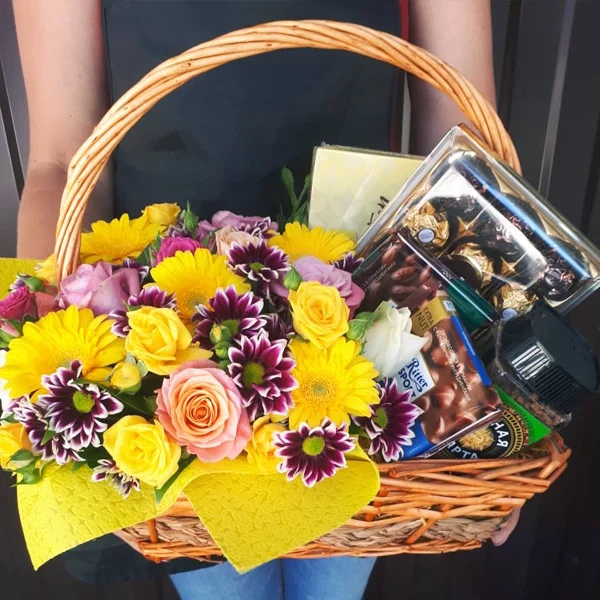 Стандартный: герберы - 3 шт., розы (микс) 20 см - 6 шт., хризантемы - 2 шт., шоколад "Ritter sport" - 1 шт., конфеты "Ferrero Rocher" - 1 шт., конфеты "Alpen Gold" - 1 шт., кофе черная карта - 1 шт., декоративная зелень, оазис, корзина средняя, фетр.