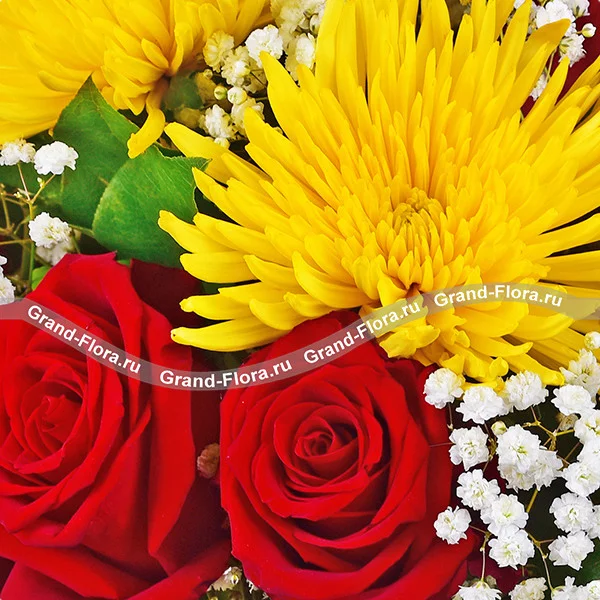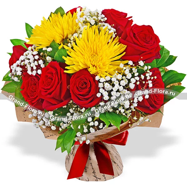 Уменьшенный: роза красная (50 см) - 5 шт., хризантема одноголовая (желтая) - 2 шт., гипсофила - 1 шт., крафт, лента.