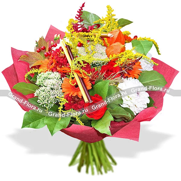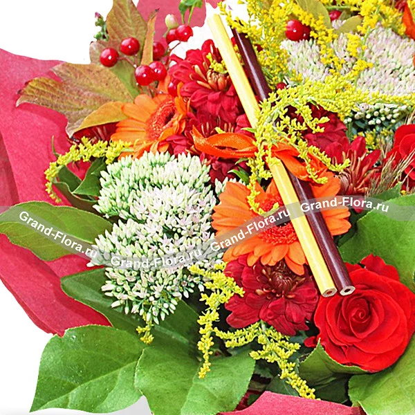 Уменьшенный: гербера оранжевая - 2 шт., роза красная (50 см) - 3 шт., хризантема одноголовая белая - 1 шт., очиток - 2 шт., фезалис - 1 шт., салал - 2 шт., солидаго - 2 шт., гиперикум - 1 шт., фетр бордовый, карандаши 4 шт., лента красная.