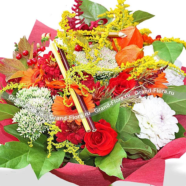 Стандартный: гербера оранжевая - 3 шт., роза красная (50 см) - 5 шт., хризантема одноголовая белая - 2 шт., очиток - 2 шт., фезалис - 1 шт., салал - 2 шт., солидаго - 2 шт., гиперикум - 1 шт., фетр бордовый, карандаши 4 шт., лента красная.