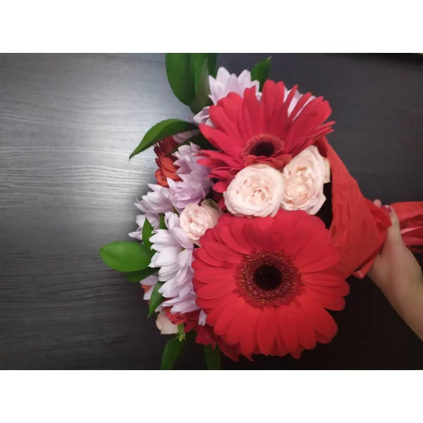 Уменьшенный: Гербера красная/малиновая/розовая микс - 3 шт., хризантема белая кустовая - 1 шт., роза кустовая кремовая - 1 шт., салал - 2 шт., фетр красный.