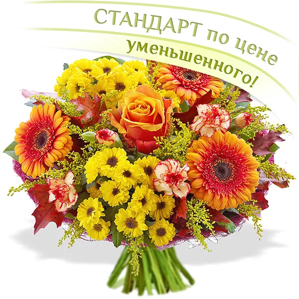 Стандартный (на фото): роза оранжевая - 1 шт., гербера оранжевая - 3 шт., хризантема желтая кустовая (мелкоцветная) - 2 шт., гвоздика кустовая оранжевая - 2 шт., солидаго - 3 шт., сетка бордовая.