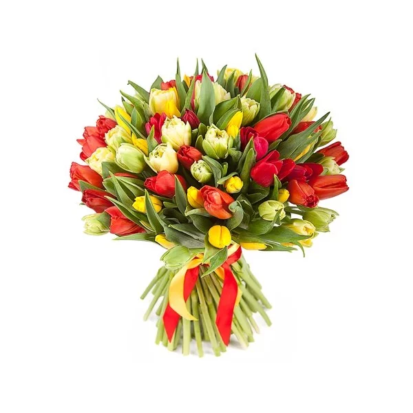 Стандартный: тюльпаны разноцветные (желтый, белый, красный, оранжевый) - 55 шт., лента красно-желтая.