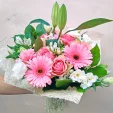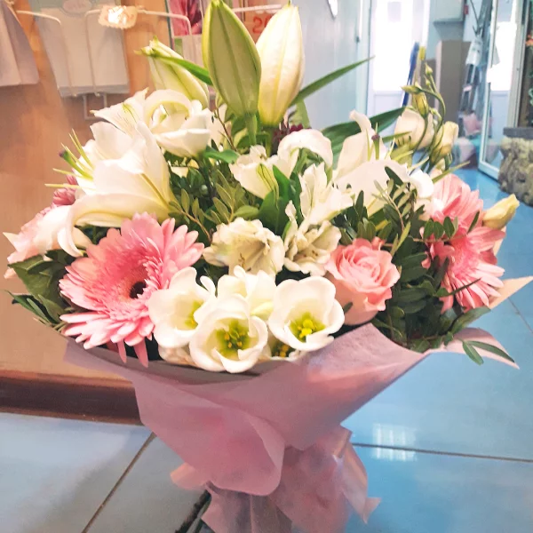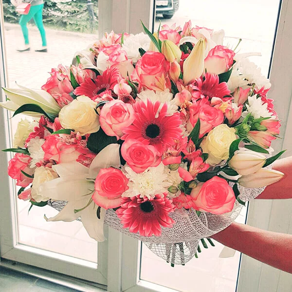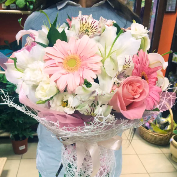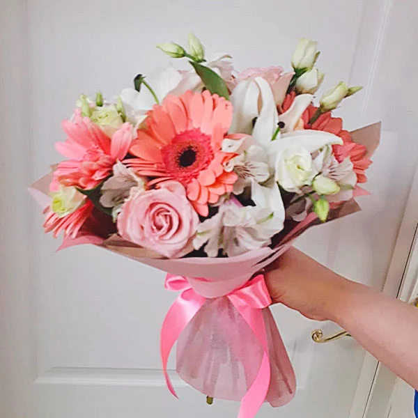 Утонченный  микс состоит из элегантных розовых роз, пленительных белых эустом, шикарных лилий и альстромерий, а также из гербер в тон розам. Букет превосходно подойдет на подарок дорогой маме, а также любимой девушке в честь дня рождения.В довершении, можете  преподнести его молодоженам в день свадьбы - они по достоинству оценят изящность композиции.