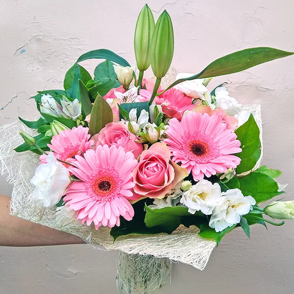 ЛЮКС: роза розовая - 7 шт., гербера розовая - 7 шт., лилия белая - 2 шт., эустома белая - 4 шт., альстромерия белая - 5 шт., фетр розовый, крафт, лента розовая. Примерный размер: 35Х35 см.