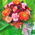 Уменьшенный (на фото): роза кремовая - 1 шт., гербера кремовая - 2 шт., гвоздика розовая - 3 шт., хризантема бордовая кустовая - 2 шт., рускус (салал) - 2 шт., фетр, декор осенние листья.