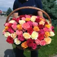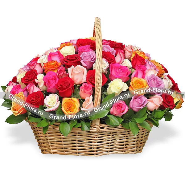 Роза ассорти - 101 шт., рускус - 10 шт., оазис, корзина большая.