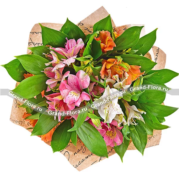 Стандартный: альстромерия разноцветная - 9 шт., декоративная зелень, упаковка крафт, лента фиолетовая.