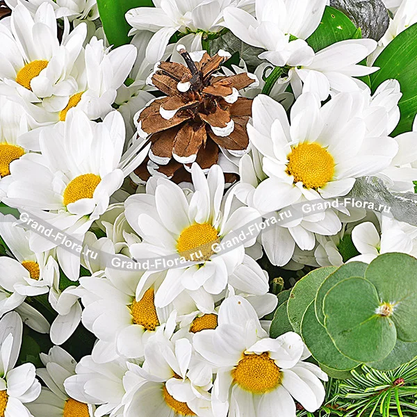 Стандартный: хризантема кустовая белая - 5 шт., эвкалипт - 2 шт., рускус - 2 шт., ель, шишки - 2 шт., упаковка крафт, лента.