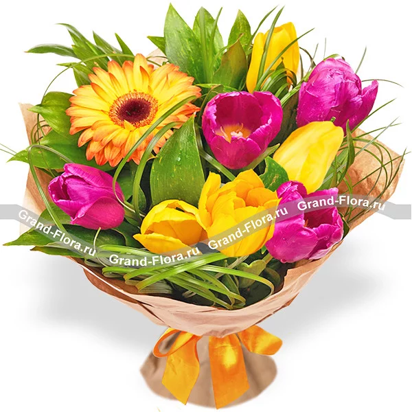 Фееричные цвета этого букета из тюльпанов способны улучшить настроение на 100%!!! Закажите его в праздник или в будний день, маме или жене, бизнес партнеру или просто понравившейся девушке, в любом случае о Вас вспомнят с самыми теплыми чувствами! Удивительный букет!