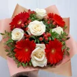 Уменьшенный: роза белая - 3 шт, гербера красная - 2 шт., гиперикум, декоративная зелень, упаковка крафт., лента, Примерный размер: 20Х20 см.