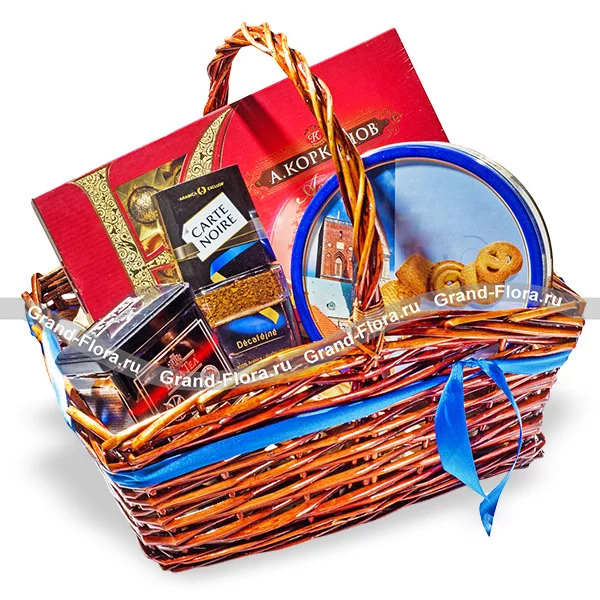 Стандартный: конфеты "Коркунов" - 190 г., печенье в железной коробке 1 шт., чай "Beta Tea" - 100 г., кофе "Carte Noire" - 95 г., декор, корзина.