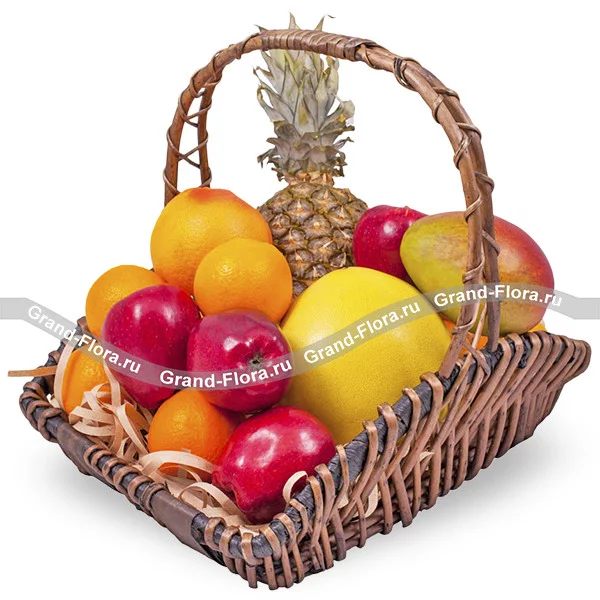 Стандартный: апельсины - 1 кг., мандарины - 1 кг., яблоки красные - 1 кг., манго - 2 шт., помело - 1шт., ананас - 1 шт., декор, корзина.