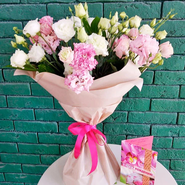 Стандартный: эустома розовая - 7 шт., эустома белая - 4 шт., декоративная зелень, упаковка крафт, лента розовая.