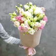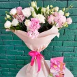 Уменьшенный:  эустома розовая - 3 шт., эустома белая - 4 шт., декоративная зелень, упаковка крафт, лента розовая.
