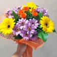 Стандартный (на фото): хризантема кустовая ромашковая (фиолетовая) - 3 шт, гербера желтая - 3 шт, роза кустовая оранжевая/розовая - 1 шт (в центре), рускус или салал, фетр оранжевый. Примерный размер: 25Х25 см.