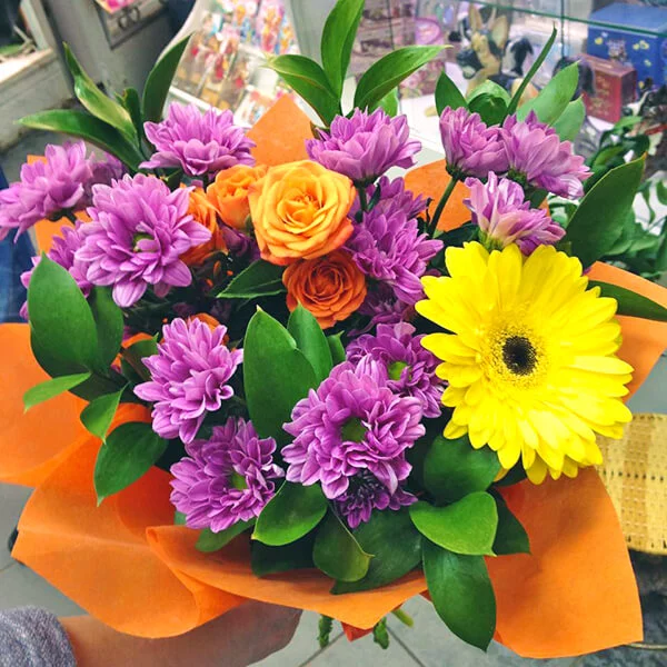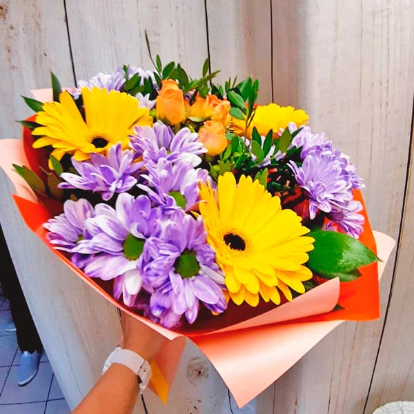 Аккуратный и стильный  букет непременно вызовет восхищение своего счастливого обладателя. Сочетание оранжевых кустовых роз и фиолетовой хризантемы на фоне крупных цветков желтой герберы подчёркнуто насыщенно-зелёными листьями салала. Совершенство можно подарить, когда оно воплощено в цветах.