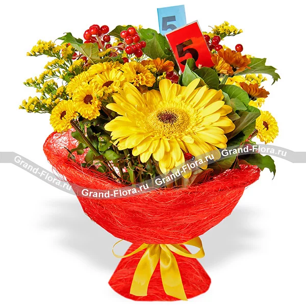 Стандартный: желтые/оранжевые герберы - 3 шт., хризантема кустовая ромашковая желтая - 2 шт., хризантема кустовая ромашковая оранжевая - 2 шт., гиперикум, декоративная зелень, школьный декор, упаковка, лента.