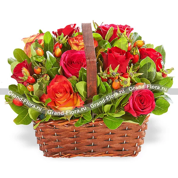 Стандартный: роза красная - 8 шт., роза оранжевая - 7 шт., шиповник(возможна замена на гиперикум/хризантему), декоративная зелень., оазис, корзина,