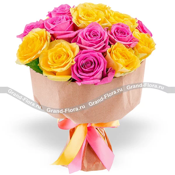 Букет создан из желтых роз  и розовых роз сорта Аква, необычное сочетание цвета, придает всей композиции необъяснимую свежесть и притягательность. Стильная крафтовая упаковка и лента в цвет букета, ставит финальный аккорд  в концепте букета. Размер зависит от выбранного Вами количества роз. Обращаем Ваше внимание, что состав и оформление букета могут отличаться.