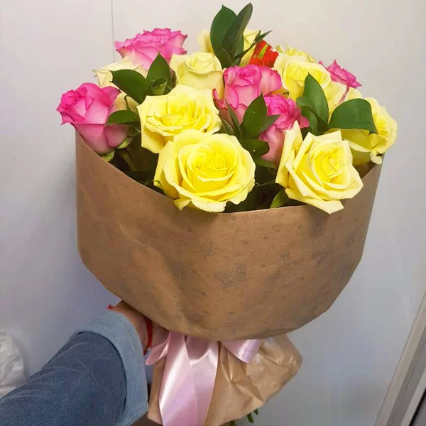 Роза желтая и розовая 50-60 см(количество, выбранное Вами), упаковка крафт, лента. На фото представлен букет из 21 розы.