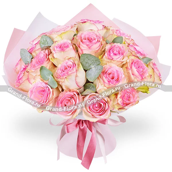 25 роз: роза розовая - 25 шт., эвкалипт - 7 шт., упаковка, лента.