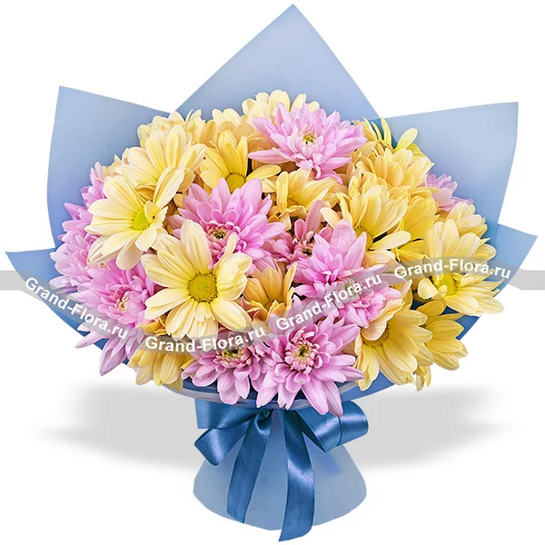Стандартный: хризантема кустовая ромашковая желтая - 7 шт., хризантема кустовая ромашковая фиолетовая - 8 шт., упаковка, лента. Примерный размер: 30Х30 см.